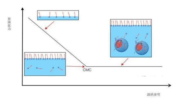但是當(dāng)濃度超過(guò)一個(gè)點(diǎn)時(shí),表面活性劑會(huì)開始抱團(tuán),形成膠束,界面張力不再下降,這個(gè)濃度叫做臨界膠束濃度。