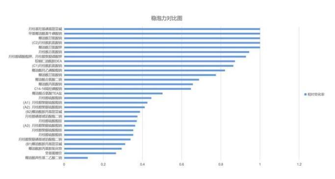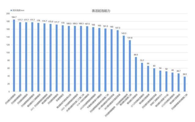 通過(guò)對(duì)比和排序,我們很快就能篩選出起泡能力好的表活劑,同時(shí)也能得到表活劑的起泡規(guī)律:(ps:由于相同原料出于不同廠商,其泡沫性能也存在差異,此處用不同大寫字母代表不同的原料廠商)