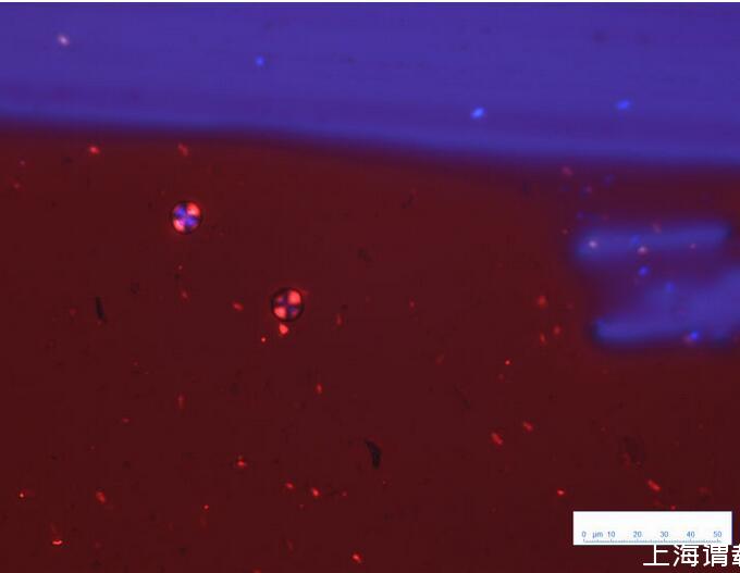 紅色的部分為墨水殘余物的涂片,藍(lán)紫色是載玻片本身在偏光鏡下的顏色。圖中可以看到兩個(gè)標(biāo)準(zhǔn)的馬耳他十字,基本上能夠驗(yàn)證“sheen是結(jié)晶導(dǎo)致”這一說(shuō)法