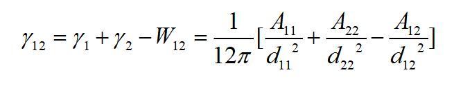 為物質(zhì)1的Hamaker常數(shù)。該作用勢(shì)能就相當(dāng)于本體的內(nèi)聚功。從表面自由能的定義不難看出,當(dāng)將本體沿本體內(nèi)的一個(gè)界面分開時(shí),單位面積需要克服內(nèi)聚力所做的功就等于這個(gè)作用勢(shì)能。由于分開后形成兩個(gè)新表面,因此每個(gè)表面上的勢(shì)能等于該勢(shì)能的一半。因此物體的表面自由能(表面張力)也等于該作用勢(shì)能的一半,即