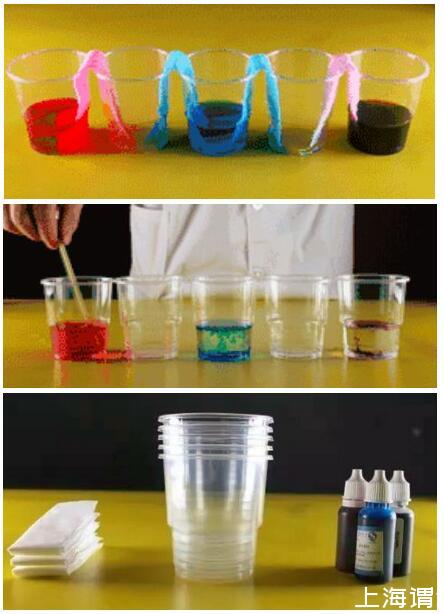 實(shí)驗(yàn)材料:紙巾、透明杯子、色素(紅、綠、藍(lán)或任意三種顏色)