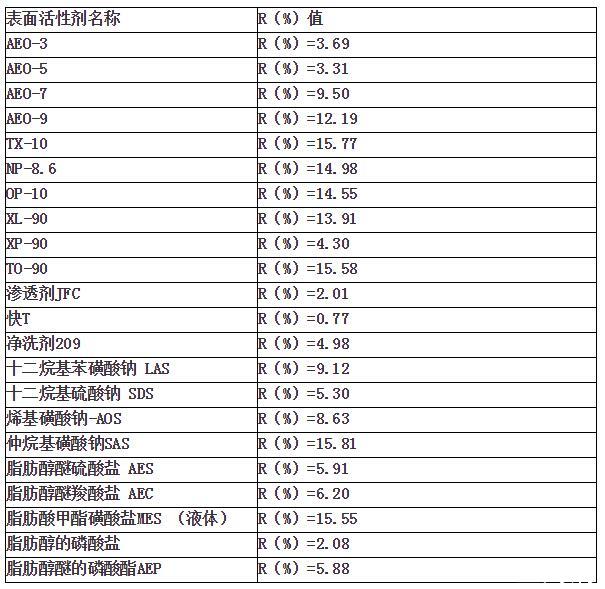 R值越大,表明凈洗能力越強,該測試標(biāo)準(zhǔn)可用來表征表面活性劑對一般污垢的去除,不適用于反映油脂和蠟質(zhì)的去除能力。