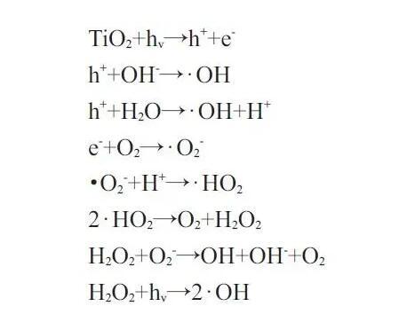 根據價帶理論,Ti O2為光催化劑,當吸收大于其帶隙的光能時,電子從價帶激發(fā)到導帶,產生電子(e-)-空穴(h+)對,這些放電載體可以快速遷移到催化劑顆粒的表面,在那里它們最終被捕獲并且與合適的底物發(fā)生氧化還原反應。反應式如下: