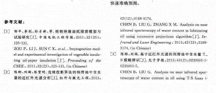 【摘要】:為了有效監(jiān)控絕緣油的運行狀態(tài),采用定量分析方法探討了微量水分對絕緣油表面張力的影響規(guī)律。通過配制不同微水含量的絕緣油樣,對每組油樣進行表面張力測試,然后對油樣進行紅外光譜掃描,獲取了油樣中水分在特征波數(shù)處(1 640,3 400,3 450,3 615cm-1)的吸光度值。分析了油液中2,6-二叔丁基對甲酚(T501)等添加劑對油樣表面張力變化規(guī)律的影響。結(jié)果表明:油樣中水分含量與水分特征吸光度值之間有較好的相關(guān)性(相關(guān)系數(shù)分別為0.964 1,0.984 8,0.984 5,0.944 0),油樣表面張力和1 640,3 400,3 450,3 615,3 650cm-1波數(shù)處油樣吸光度值的變化亦均呈現(xiàn)良好的正相關(guān)性。建立了油樣表面張力與特征波數(shù)處油樣吸光度值的多元線性回歸模型,擬合精度為0.992 8;根據(jù)模型得到的表面張力計算值與實際測量值誤差為-0.07~0.06%,吻合性較好。文中的實驗可為含微水絕緣油的表面張力檢測提供理論支撐。