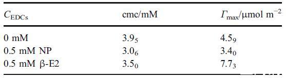 表 2 在含有 0.49 M Na2SO4 和 0.01 M H2SO4 的 5 mM hp-β-CD 存在下,HTA+ 溶液在不同 NP 或 β-E2 濃度下的 cmc 和表面過(guò)量 (Γmax) 值