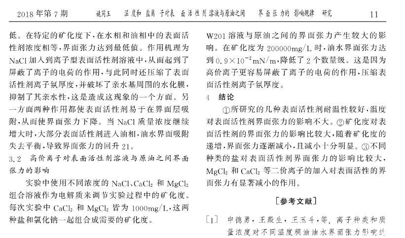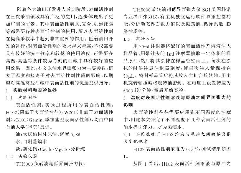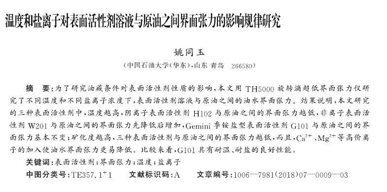 溫度和鹽離子對(duì)表面活性劑溶液與原油之間界面張力的影響規(guī)律研究