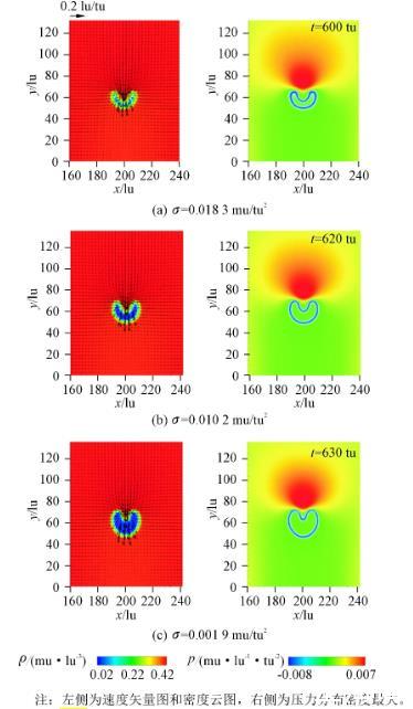 本節(jié)選取空化泡內(nèi)外初始?jí)翰瞀=0.003 8、0.006 8、0.010 2 mu/(lu·tu2)三種壓力,無量綱距離λ=1.6條件下,不同表面張力系數(shù)對(duì)空化泡潰滅過程中潰滅形態(tài)、流場、最大微射流速度和最大潰滅壓力的影響。