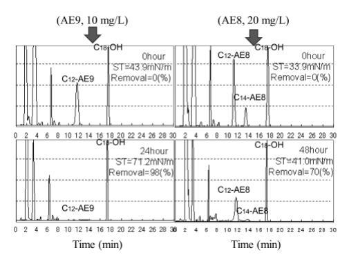 用高效液相色譜法分析生物降解過程中AE 的色譜圖如圖8 所示,其中10 毫克/升C12-AE9 的峰出現(xiàn)在11 分鐘的保留時間,作為內(nèi)標(biāo)的C18 醇出現(xiàn)在18 分鐘的保留時間。 在 8 分鐘的保留時間之前觀察到主要由衍生產(chǎn)物引起的干擾峰。 10mg/L AE9 的大部分峰在 48 小時后消失(圖 8),而圖 3 中此時基于需氧量的生物降解保持 35%。此時表面張力值達(dá)到約 72.8 mN/m . 因此,表明AE9在其生物降解率低于50%的時間內(nèi)失去了其界面活性和水生毒性。