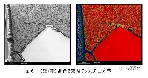 圖6為某廠商生產(chǎn)的SEM+WDS測(cè)試結(jié)果。其測(cè)試的大小范圍受限,還不到EPMA測(cè)試區(qū)域的一半,(EPMA可以使用樣品臺(tái)掃描,實(shí)現(xiàn)更大區(qū)域的分析)也就不能查看整個(gè)負(fù)極板上待測(cè)元素的分布結(jié)果。由于S元素的含量很低,測(cè)試沒有給出結(jié)果。