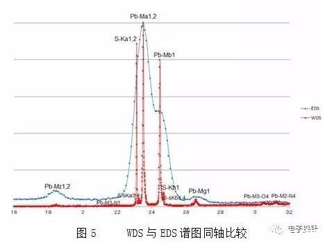 我們把此兩個(gè)譜圖放到一個(gè)坐標(biāo)軸上就能更好的對(duì)比,組合中圖5的橫軸為能量(單位keV),WDS的分辨率比EDS高出一個(gè)數(shù)量級(jí)。